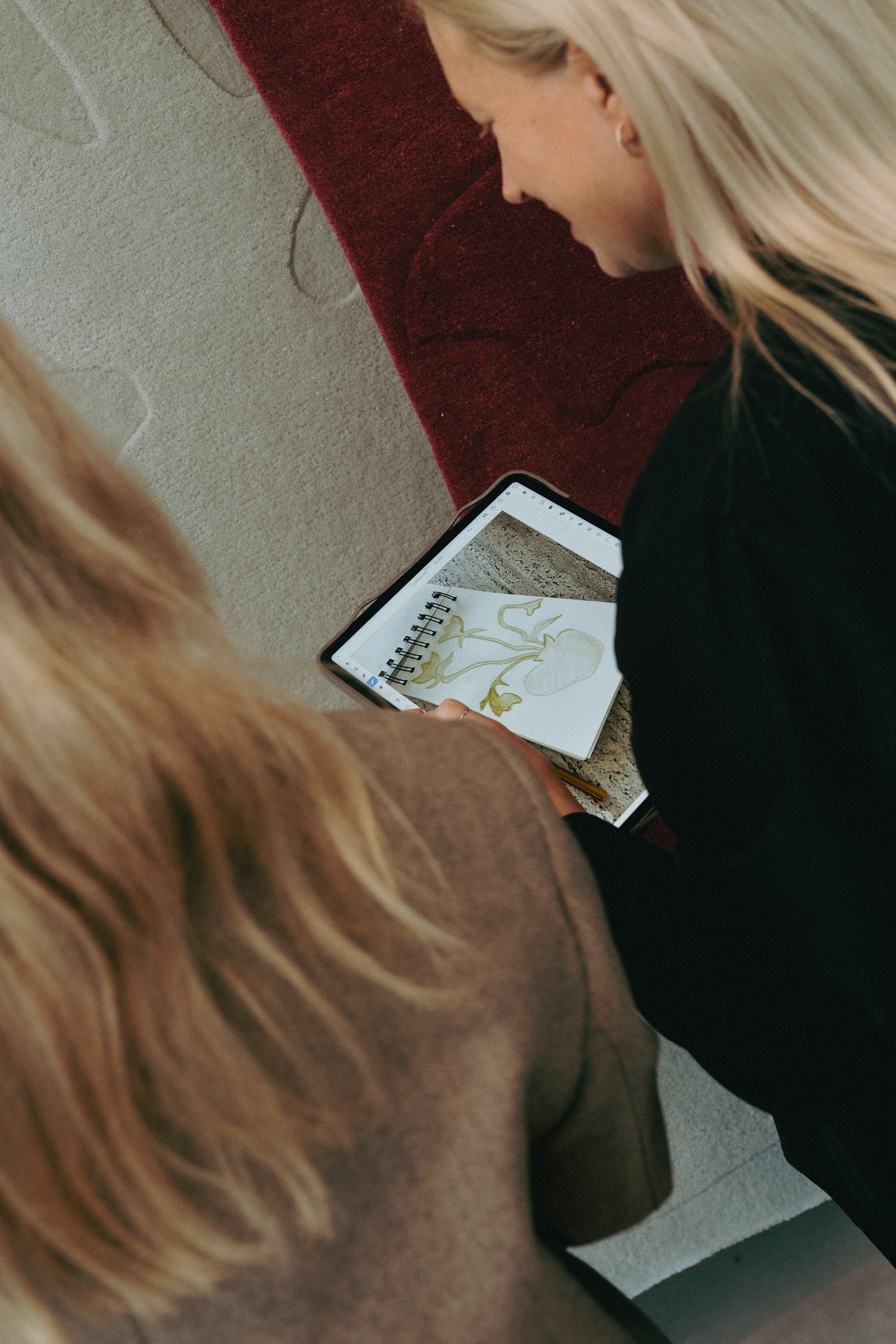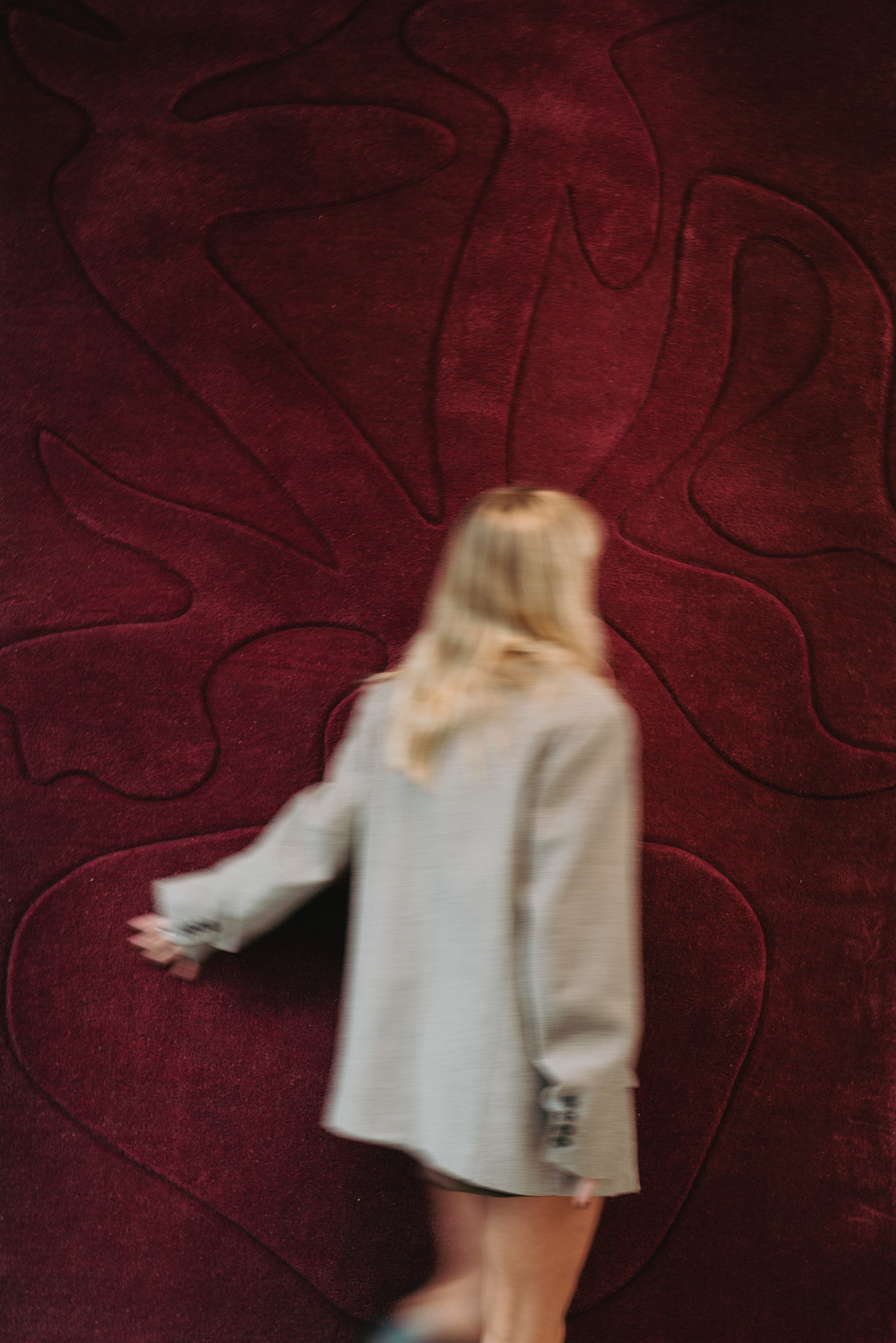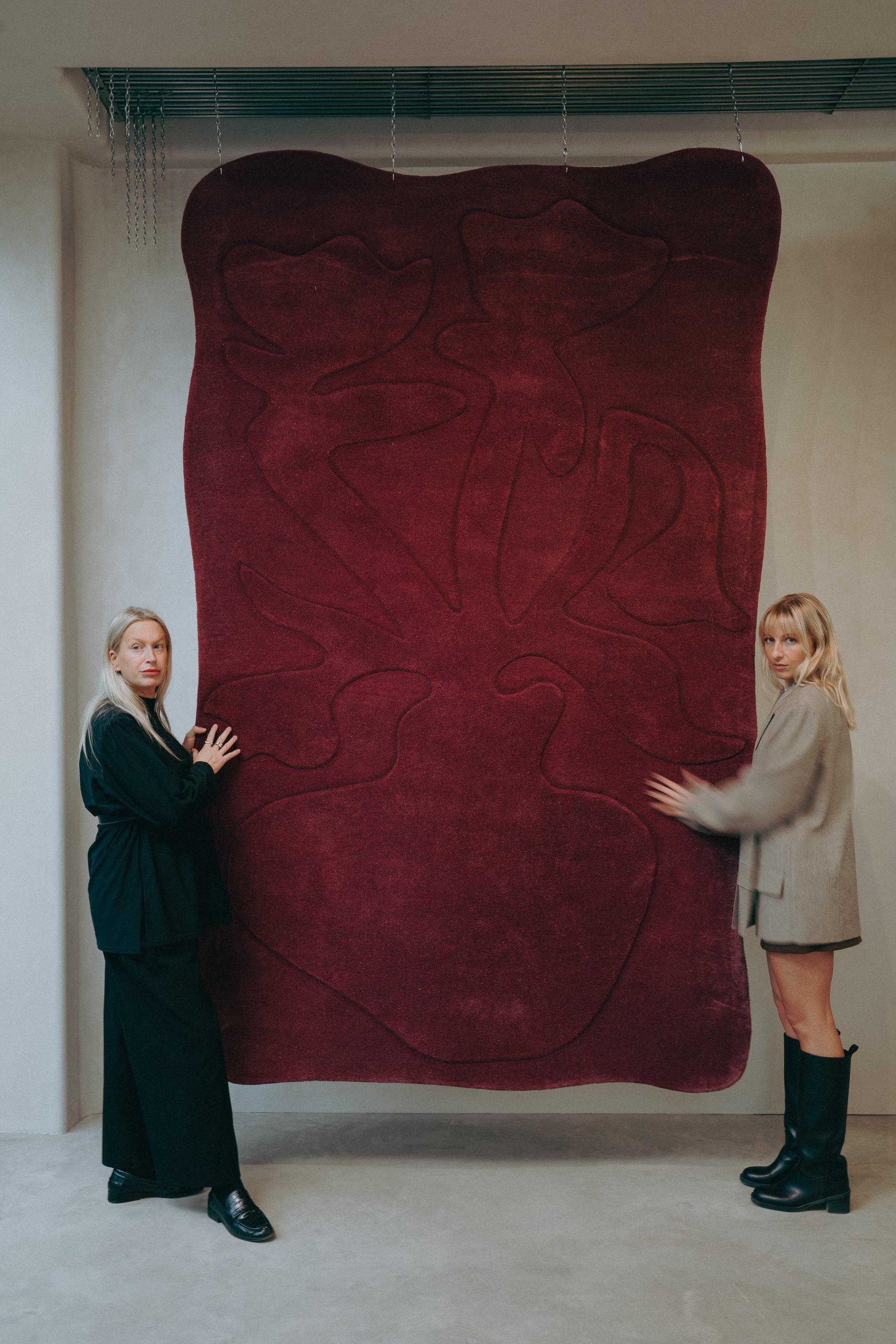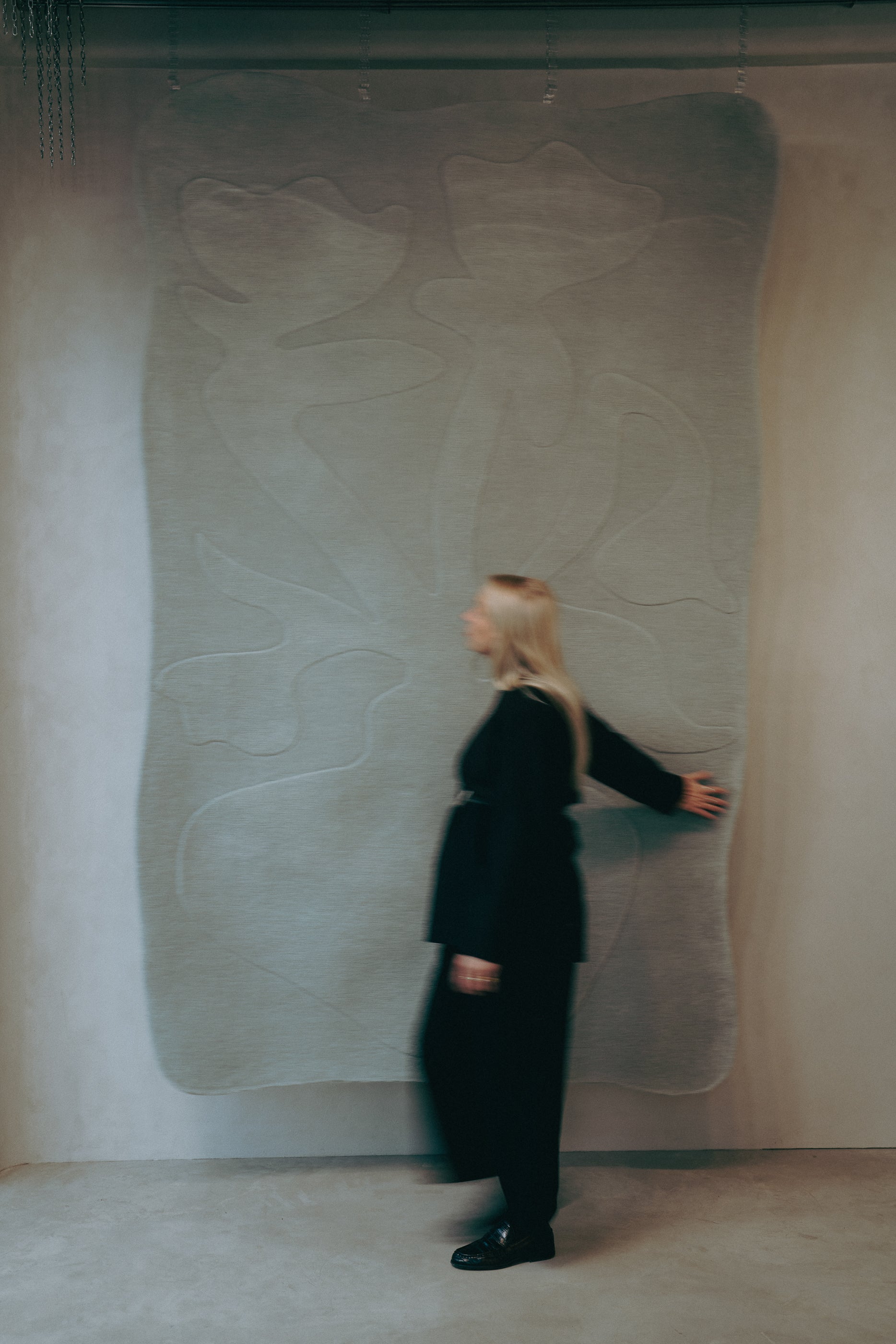 Inspired by her piece “Whispering Dreams” and its layered, tadelakt-finished surface, the collection translates an artwork into rugs that feel sculptural, calm and quietly expressive.